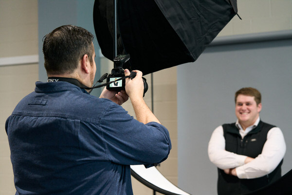 To get the headshots, we set up a simple gray paper backdrop, a flash, and reflector. Here are a couple behind-the-scenes photos of our set-up.